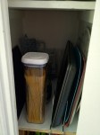 While looking for ideas on Pinterest, I came across a pantry re-do in which the blogger uses lazy susans to maximize corner space. My thought was, “That’s a great idea, but it’ll never happen in my tiny kitchen”. I took measurements of every cupboard and drawer in my kitchen, and set out for Ikea in search of airtight food containers and ideas. I picked up some great glassware (the “slom” series), and some other things, like some “book dividers” designed to separate books on shelves, but which I used to separate baking sheets and trays.