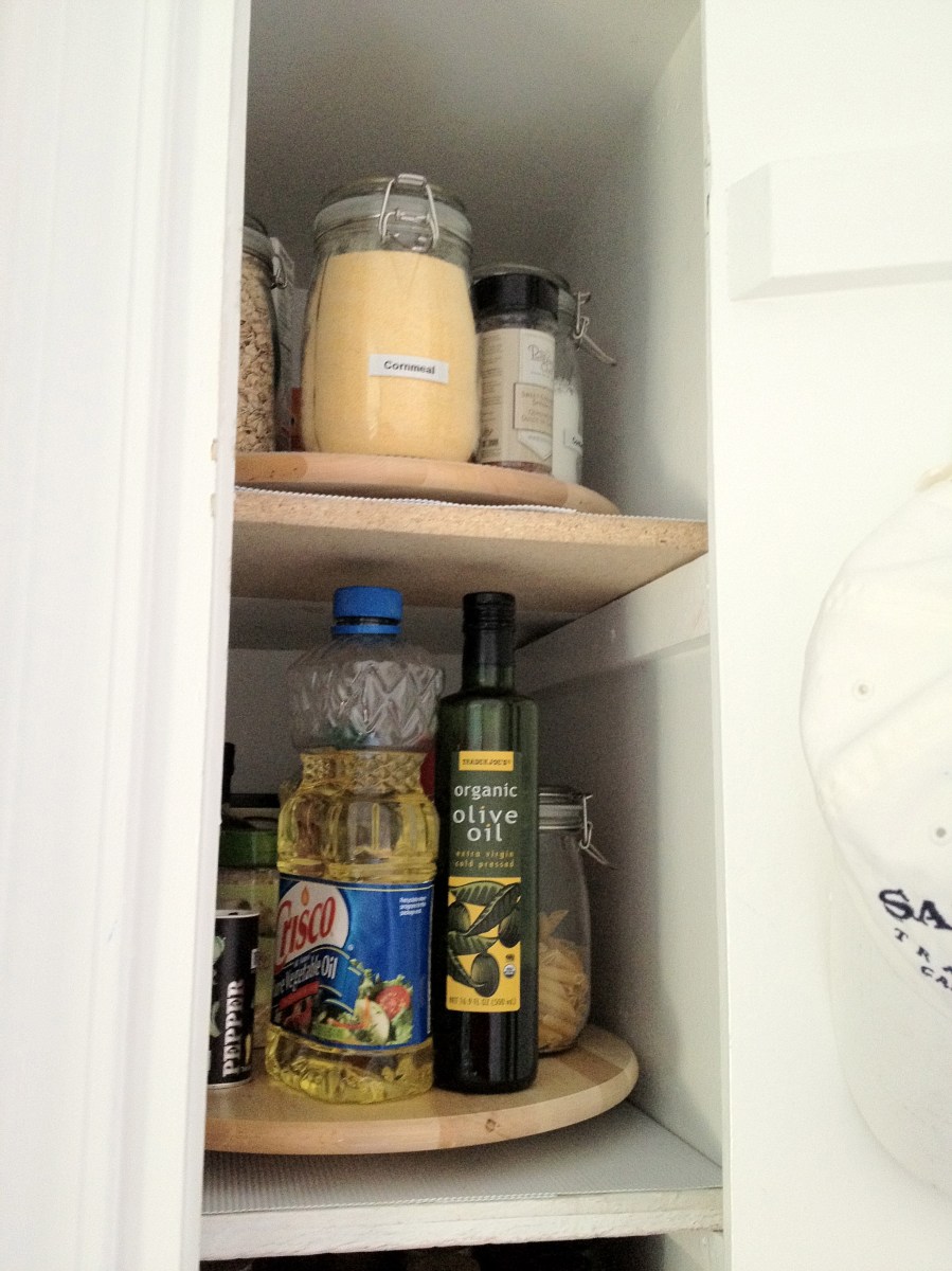 The First “After” Published July 18, 2012 at 2448 × 3264 in The Not-So-Lazy Susan ← Previous Next → The top two shelves, loosely organized according to purpose. Top shelf is smaller amounts of baking ingredients, next shelf down is cooking (oils, dry goods, etc.).
