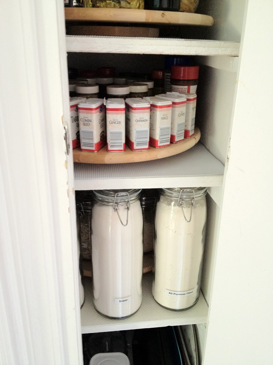 The Second “After” Published July 18, 2012 at 2448 × 3264 in The Not-So-Lazy Susan ← Previous Next → These are the next 2 shelves down. As you can see I didn’t have much headroom on the upper shelf here, so it became my Spice Carousel. The lower one has the most oft used baking goods in front (Sugar, Salt, and Flour)…