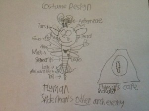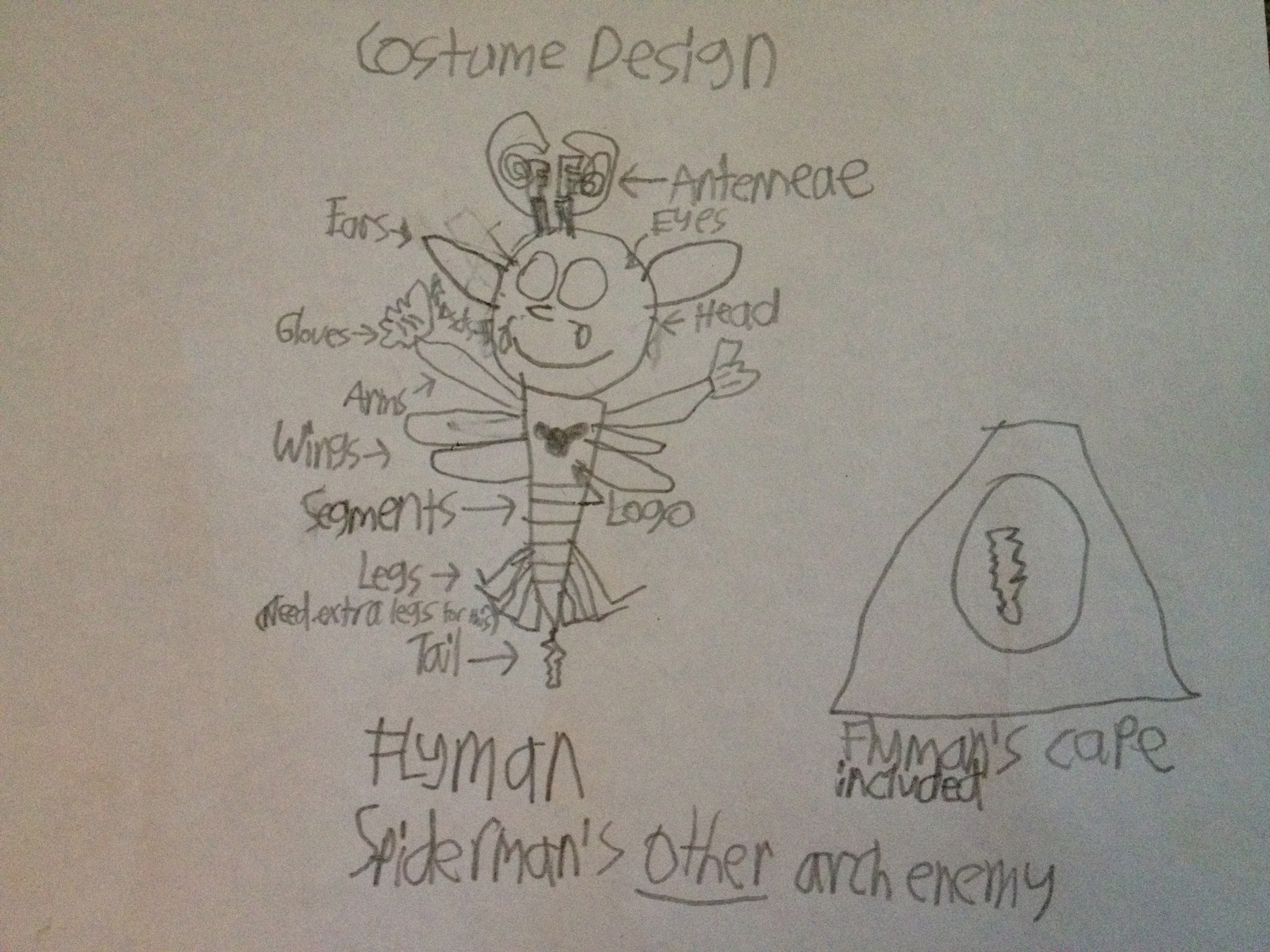 I took him a while to get going on this, and we bounced around several ideas in terms of what he could do to satisfy the first task, and we finally settled on this: He would draw a picture of the costume he wanted Grammy to help him make for Halloween, since he announced he wants to be a super hero character that he created. Once the drawing was completed, we would go to the fabric store to make some choices about what kinds of fabrics we could use, and look at sites on the internet to determine which pieces could be purchased pre-made, and which pieces we would make.