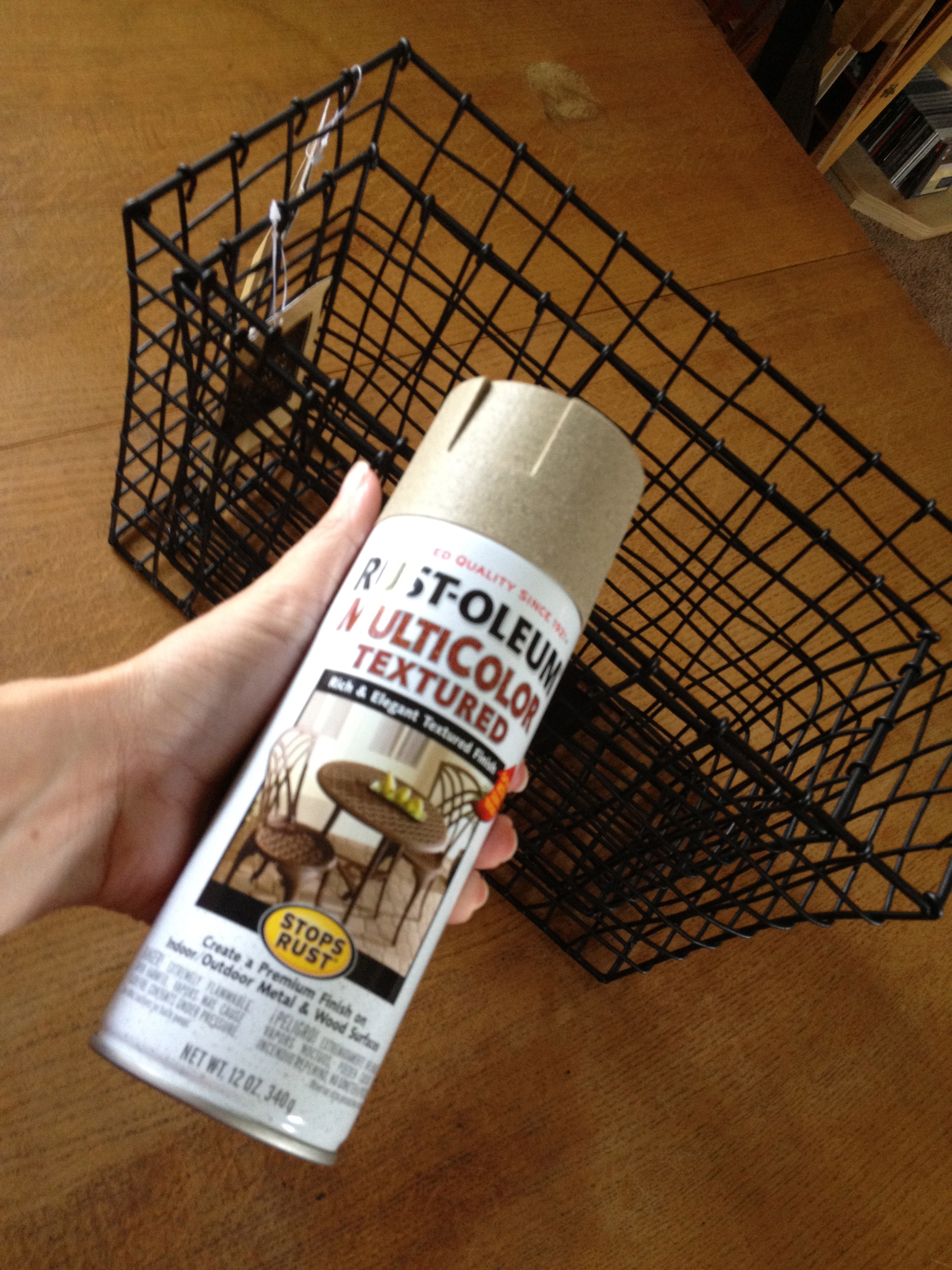 While I love black, The Man is not such a big fan, and I didn’t want these baskets to stay black. The Man introduced me to a new-ish type of spraypaint employed by one of his clients on her cabinet knobs. It has the look and feel of sand, which lends itself to the design themes of those who live near the beach (or want to):