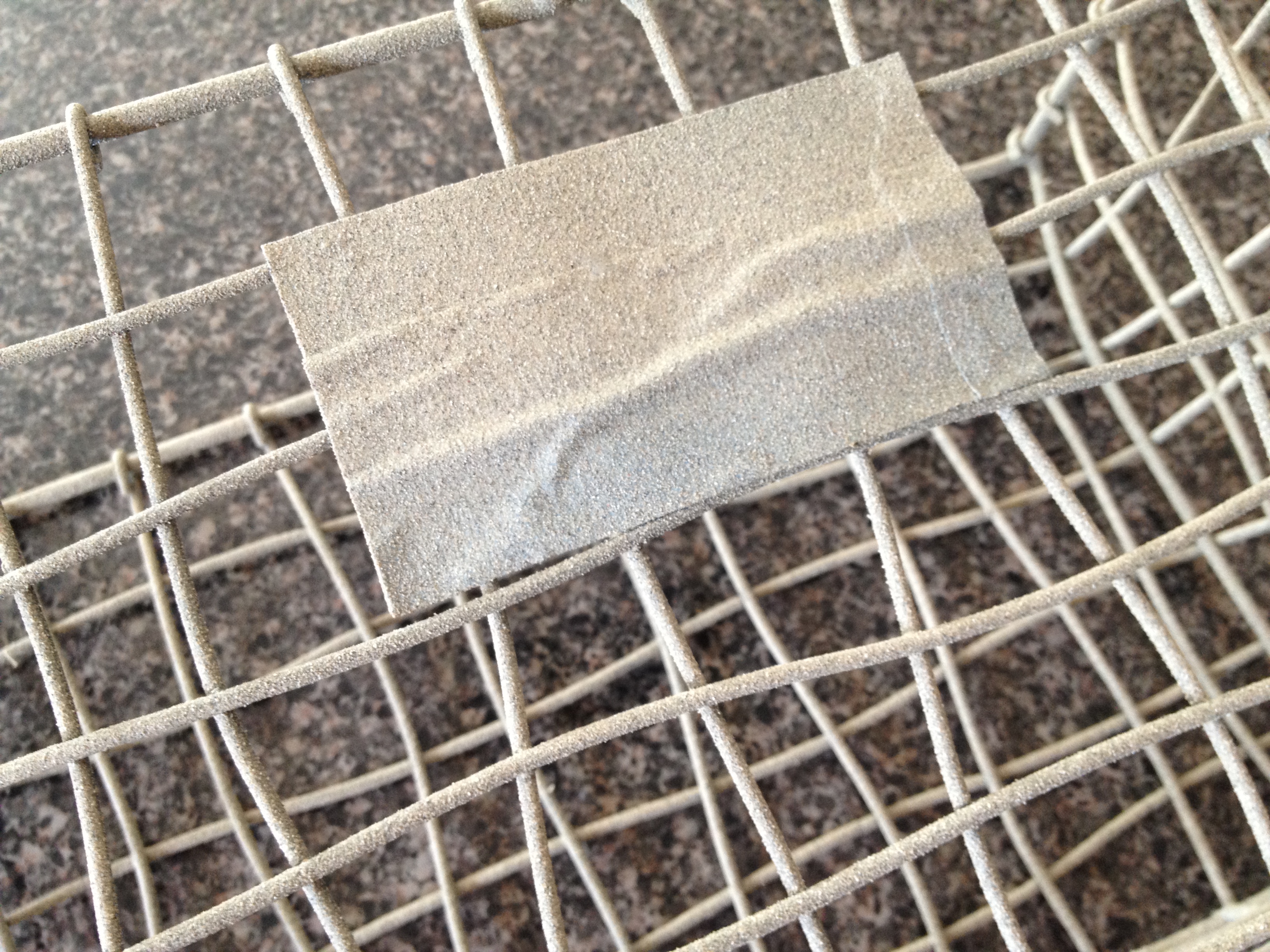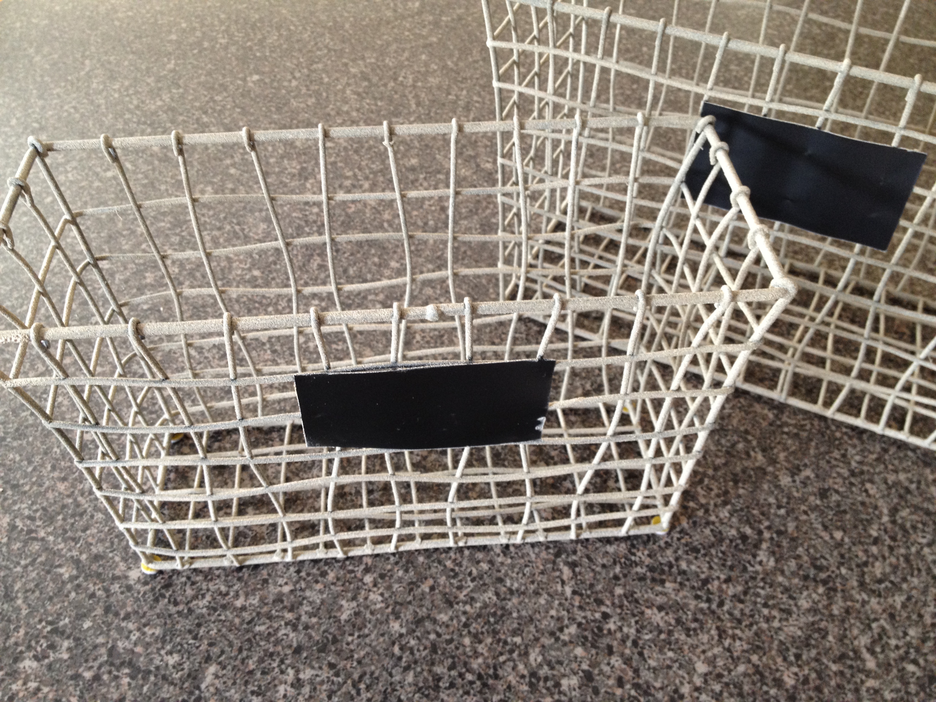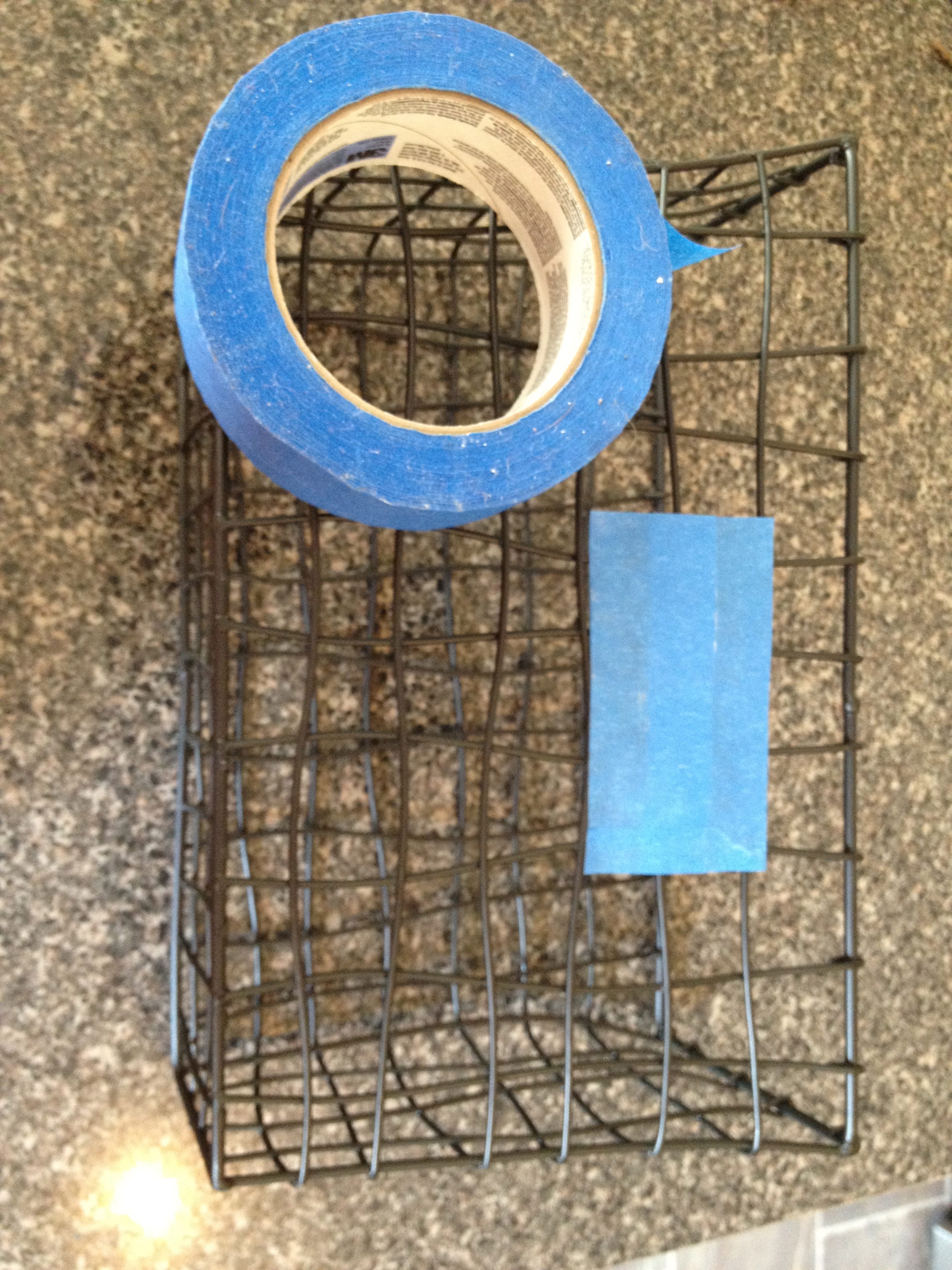 The next step was to cover the label areas with blue painters tape, because I wasn’t sure what I wanted there, but I didn’t want it to be a blank, sandy chunk of metal in the middle of the basket.