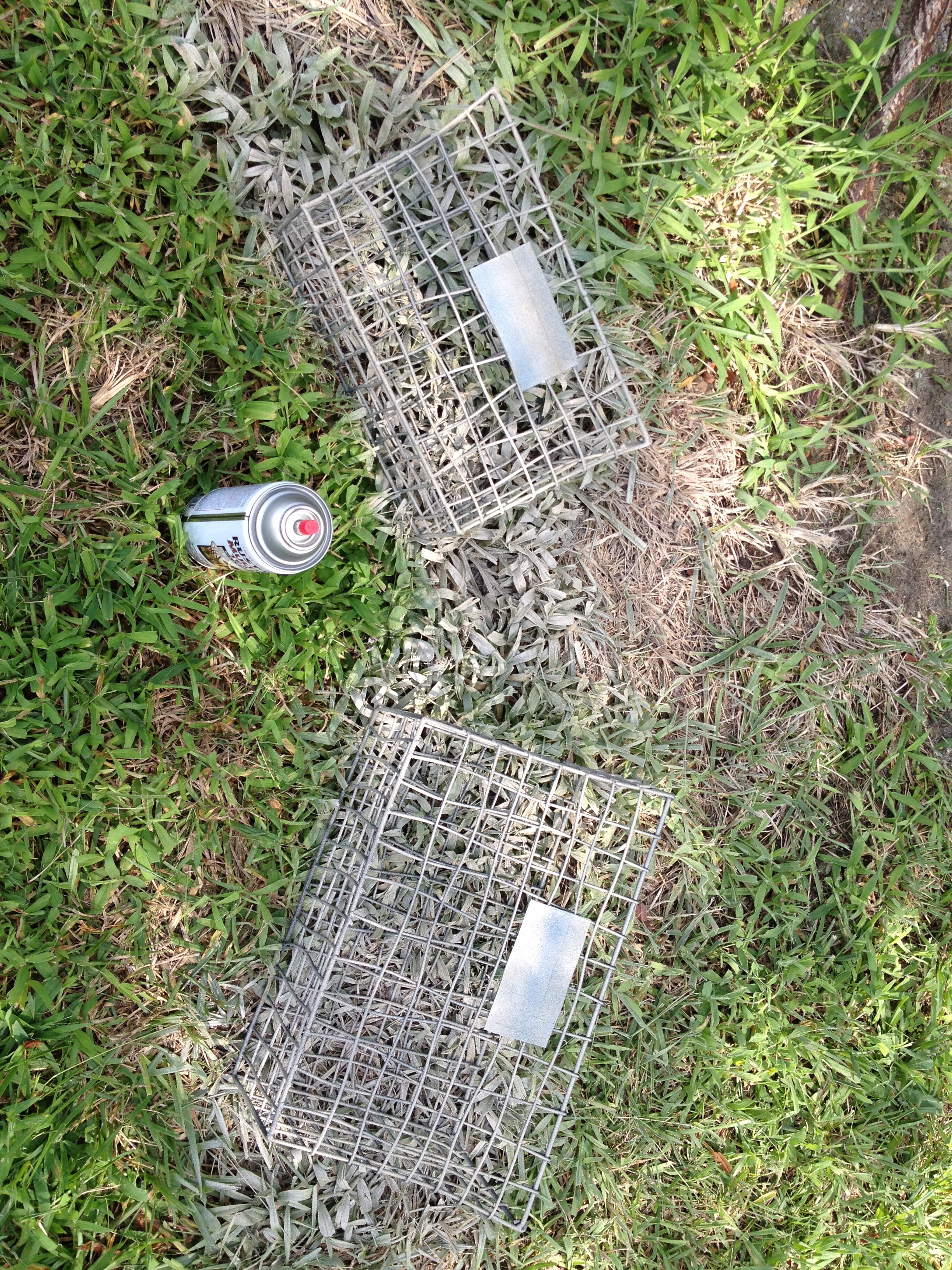 I proceeded to spraypaint the baskets, remembering only as the can emptied quickly that I was using a lot of paint on nothingness, and would need more paint. After several days of coordinating another trip to Lowe’s, and waiting for it to STOP RAINING, I was finally able to finish the painting.