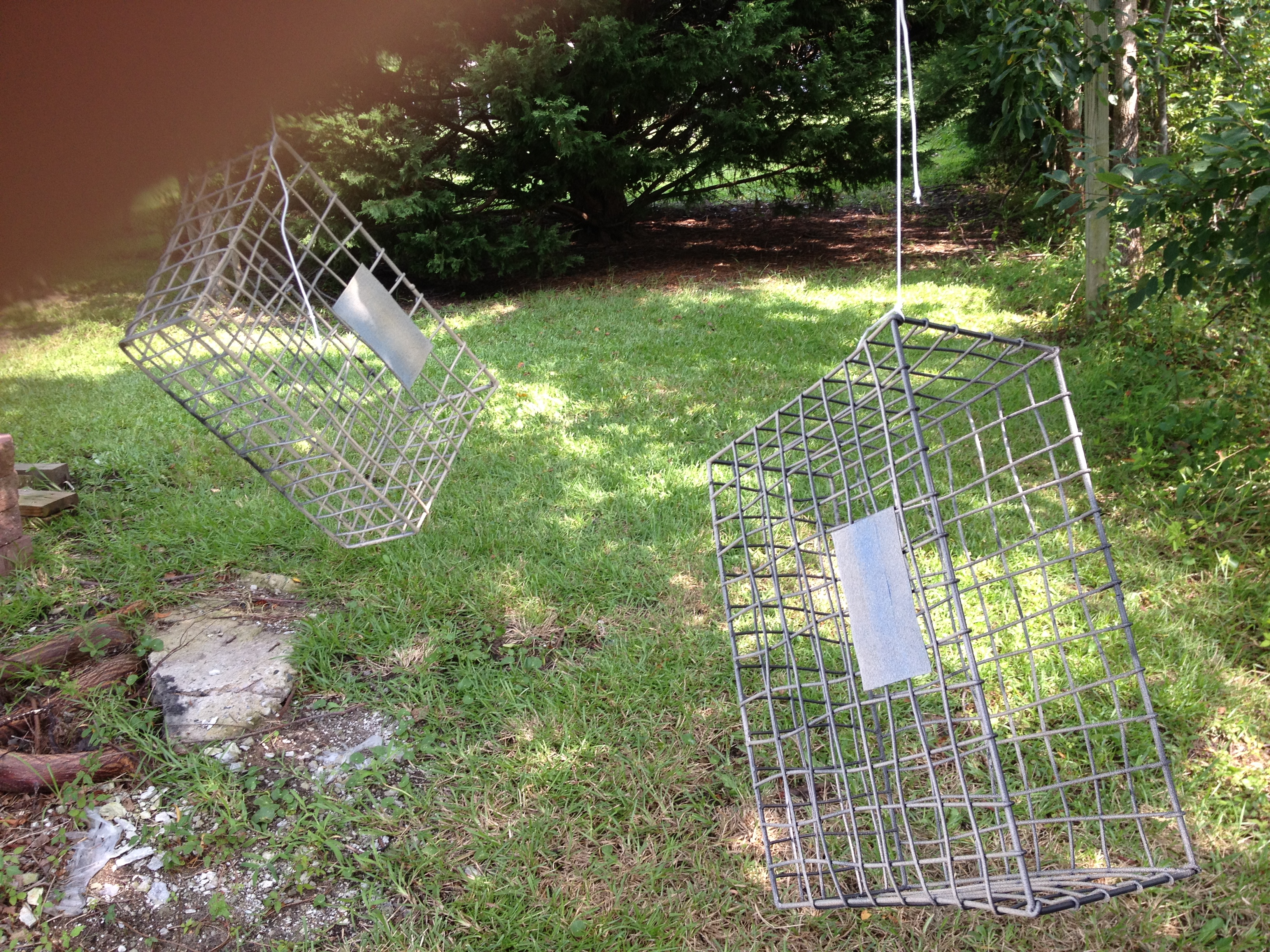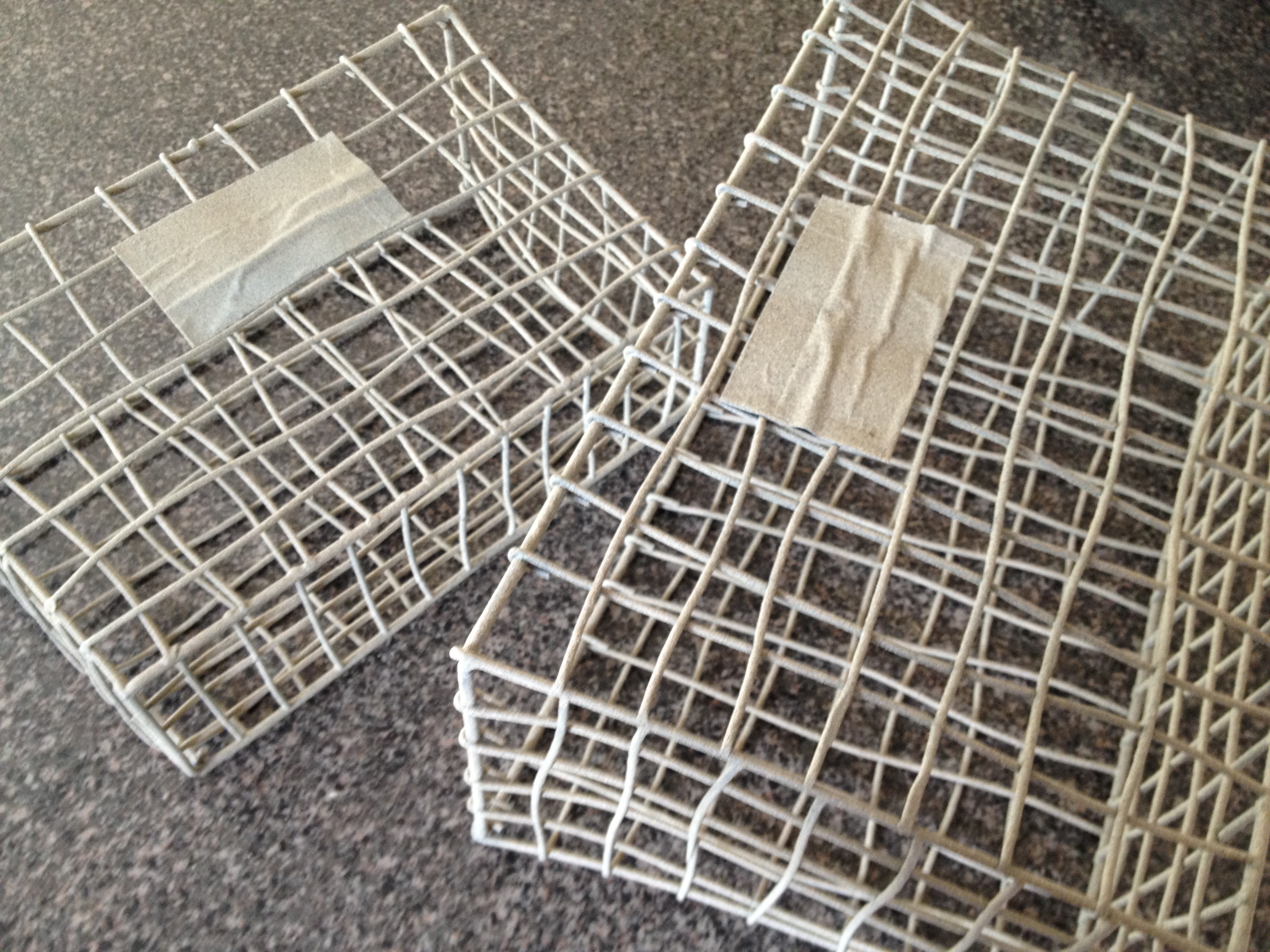 Next step: painting. I started with the baskets on the ground. The Man asked how I was going to get the part on the ground painted. I told him I’d wait until the front was dry and flip it over. He grunted or harumphed or something and proceeded to tie my baskets to a tree.