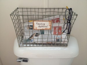 Necessity being the mother of invention, I needed a solution to our bathroom-reading-trash-throwing problem. I pinterested it (not a word? Is now.) and found great, expensive designs for bathroom magazine racks, or racks that were clearly designed for the 200 square foot bathroom. I needed something else.