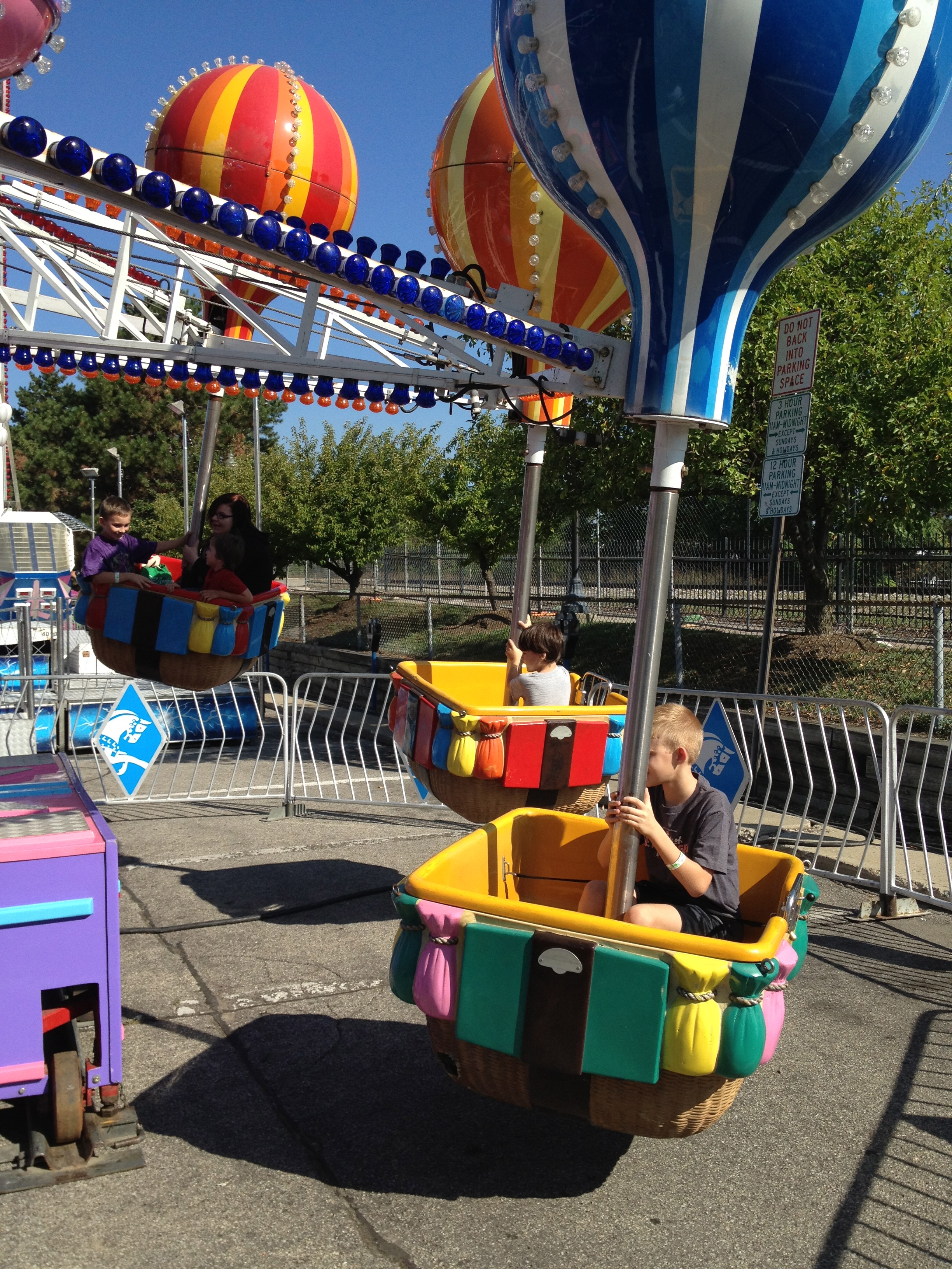 The next color issue was on the balloon ride – his favorite, apparently. The second time on the ride, someone had already taken the blue balloon, and he got upset. I told him to wait until the next go-around, and he would be able to choose first. We have used this strategy previously on the carousel in various venues, and the attendants always look at us funny, but it works.