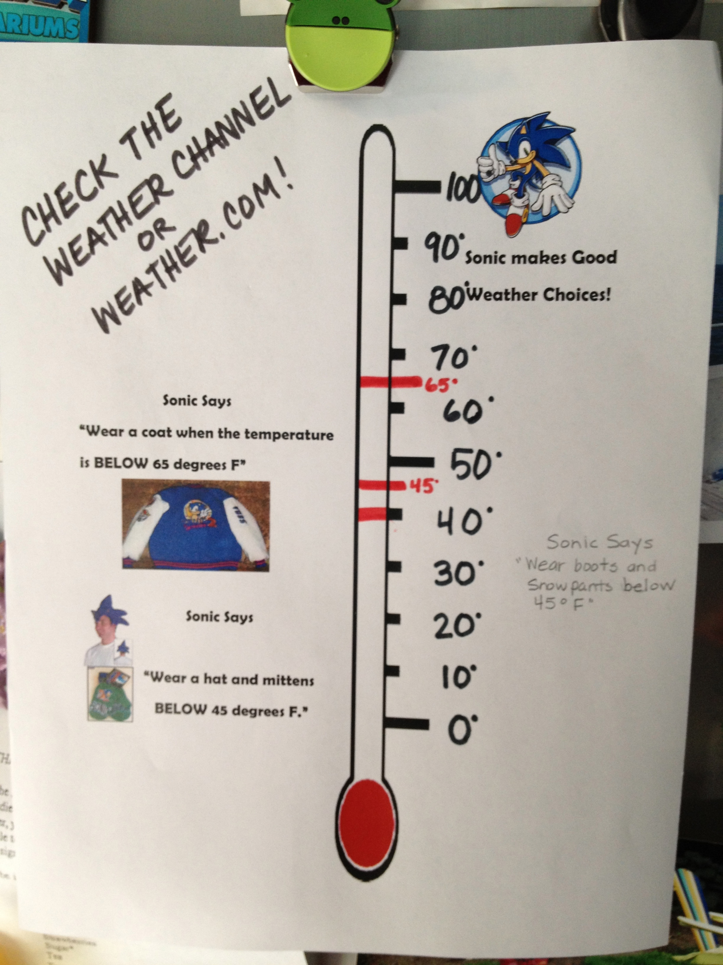 The Boy has long had issues with clothing. Last year, it became a big problem when he would refuse to wear his coat during the winter, or would wear it, grudgingly, but refuse to zip it up. It gets COLD here, and we had to find a way to work around this, as walking around without a coat or a coat unzipped is a surefire way to get hypothermia or some other nasty downside to living so far north. The Boy’s teacher came up with a chart. It had a drawing of an overcoat, just like The Boy’s coat (so smart!) and a thermometer down the side, delineated with rainbow colors marking ranges of temperature. Each color band was labeled with the type of outerwear appropriate, and the amount it needed to be zipped, for example, 50-60 degrees would say “jacket, half-zipped” or something similar.