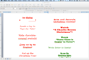 New this time around will be a calendar/”parking lot”, so that The Boy can “park” activities that he isn’t particularly interested in that day, and we can reschedule them for the weekend when we have more free time, or we can just forget about it.  These are supposed to be family activities that are fun not forced!  The only caveats are that if it is a scheduled activity (like watching the Peanuts Christmas special), it can’t be “parked”, although it could be “forgotten”.  The other is that if Mom wants to do the activity that evening, Mom may go ahead without him if he doesn’t want to (within reason – I’m not gonna leave the kid at home while I go drive around and look at the lights!).  Also new will be the timing of the gift – I used to hang them all at once, on November 30.  I think this time around, each treat will be hung the night before, after The Boy goes to bed.  That way we can avoid the frenzy that happened a couple of years ago.