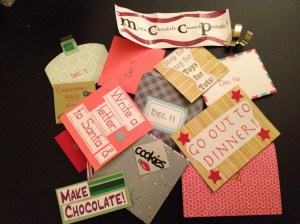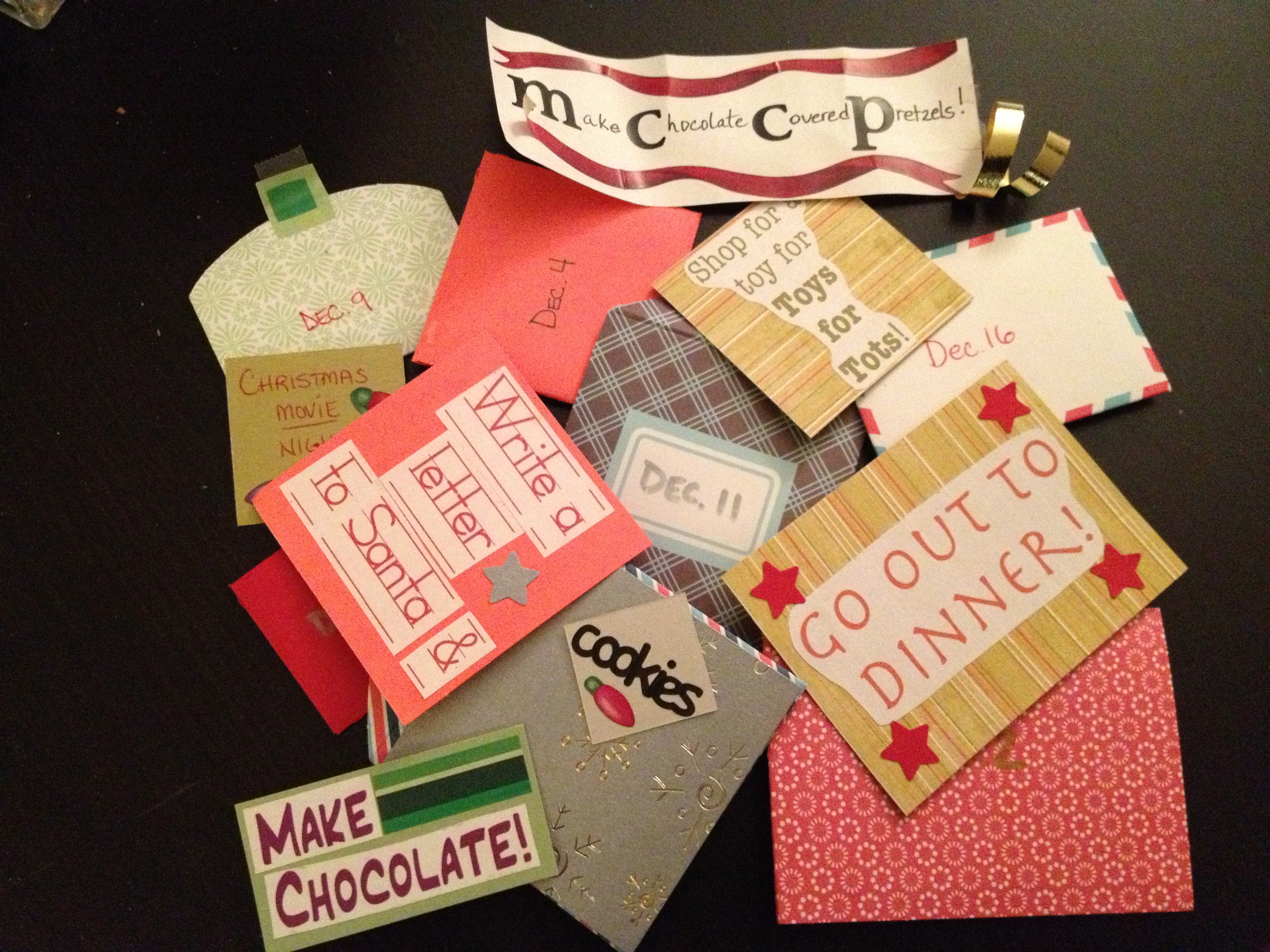 I asked The Boy if he would like to do the advent calendar again this year, and he said that he would.  But, this time, I have decided to include activities and treats every day.  I have found that scheduling too many activities can make it more stressful than fun, so this time around, the activities might be things like “send a card to a friend” or “read The Grinch together” – things that don’t require major planning and effort, or a trip in the car, or much time at all, so we don’t get burned out.  I have also decided that the treats may be as little as quarters or Chuck E. Cheese tokens (what budding little gamer wouldn’t love that?).